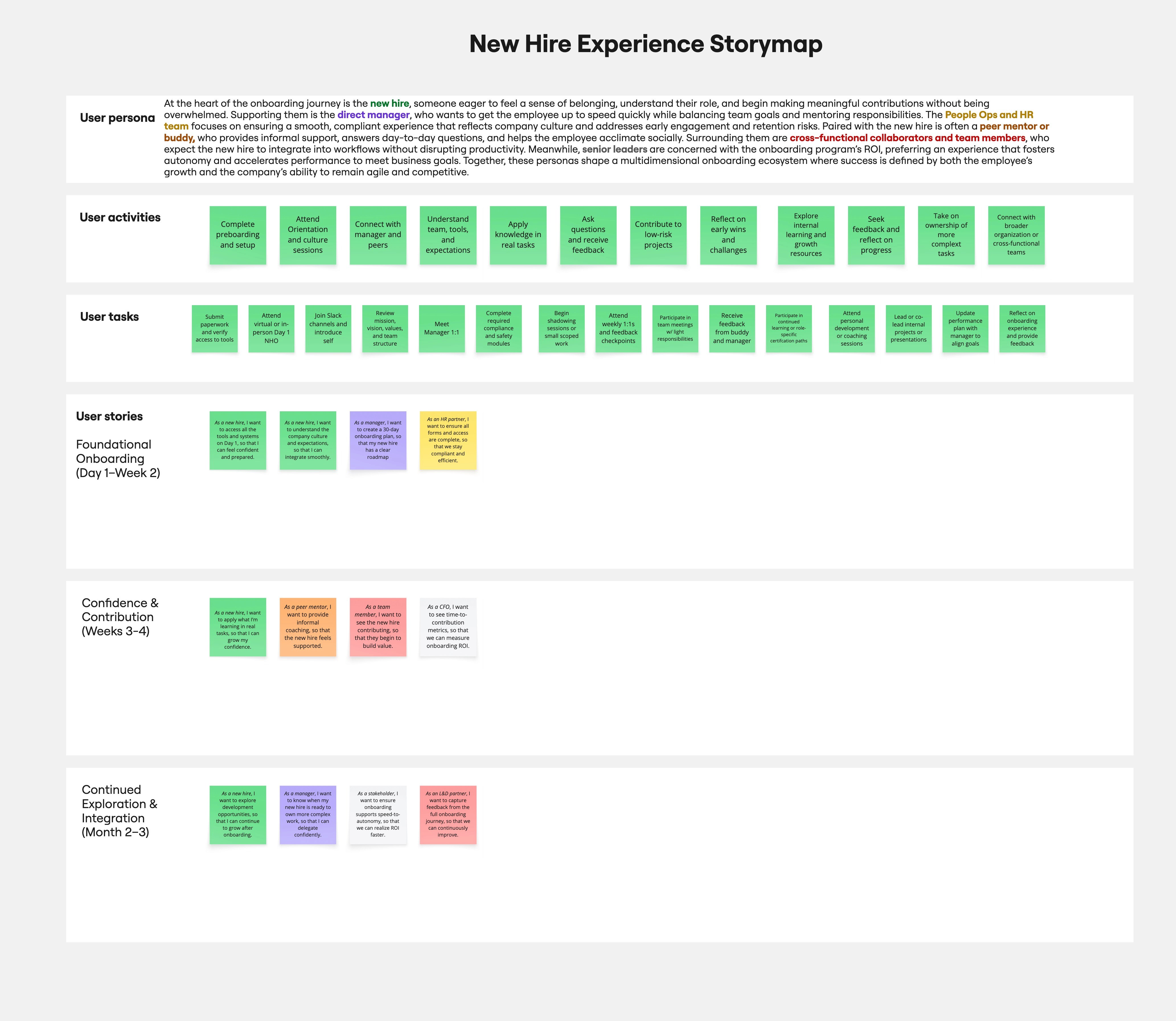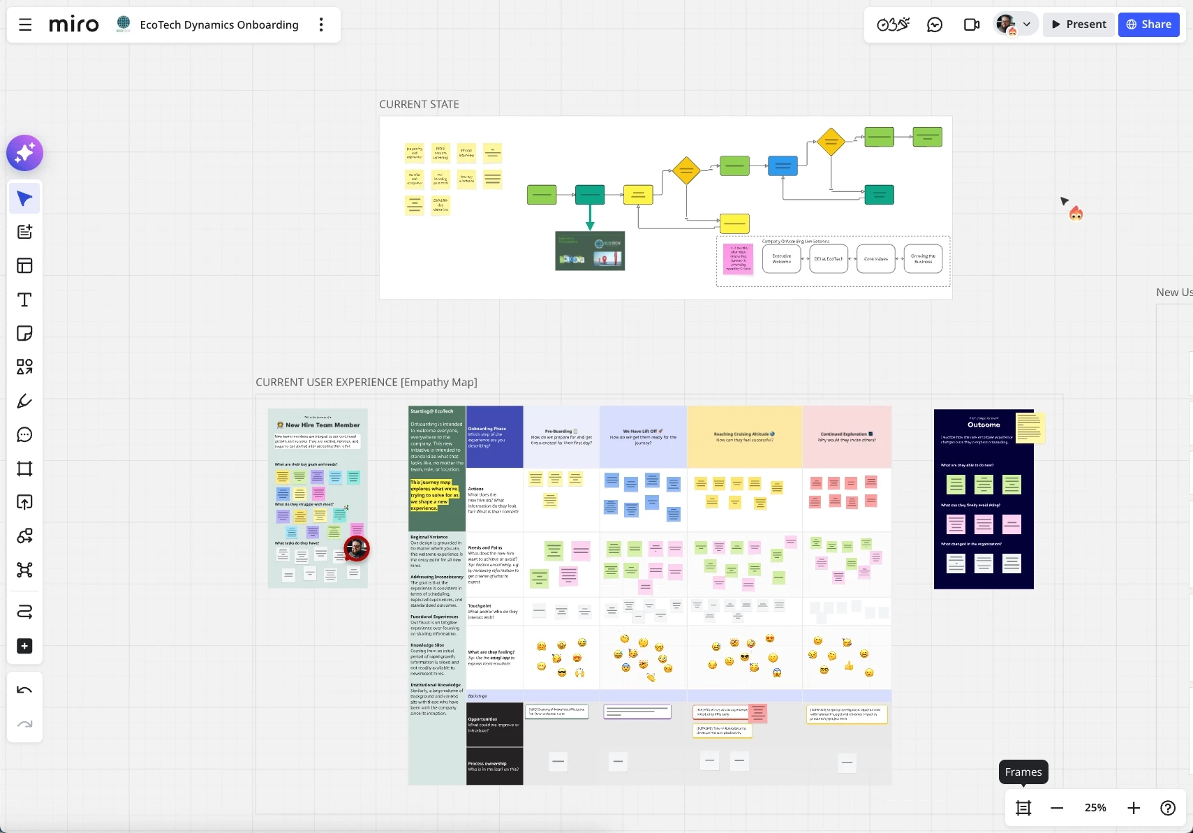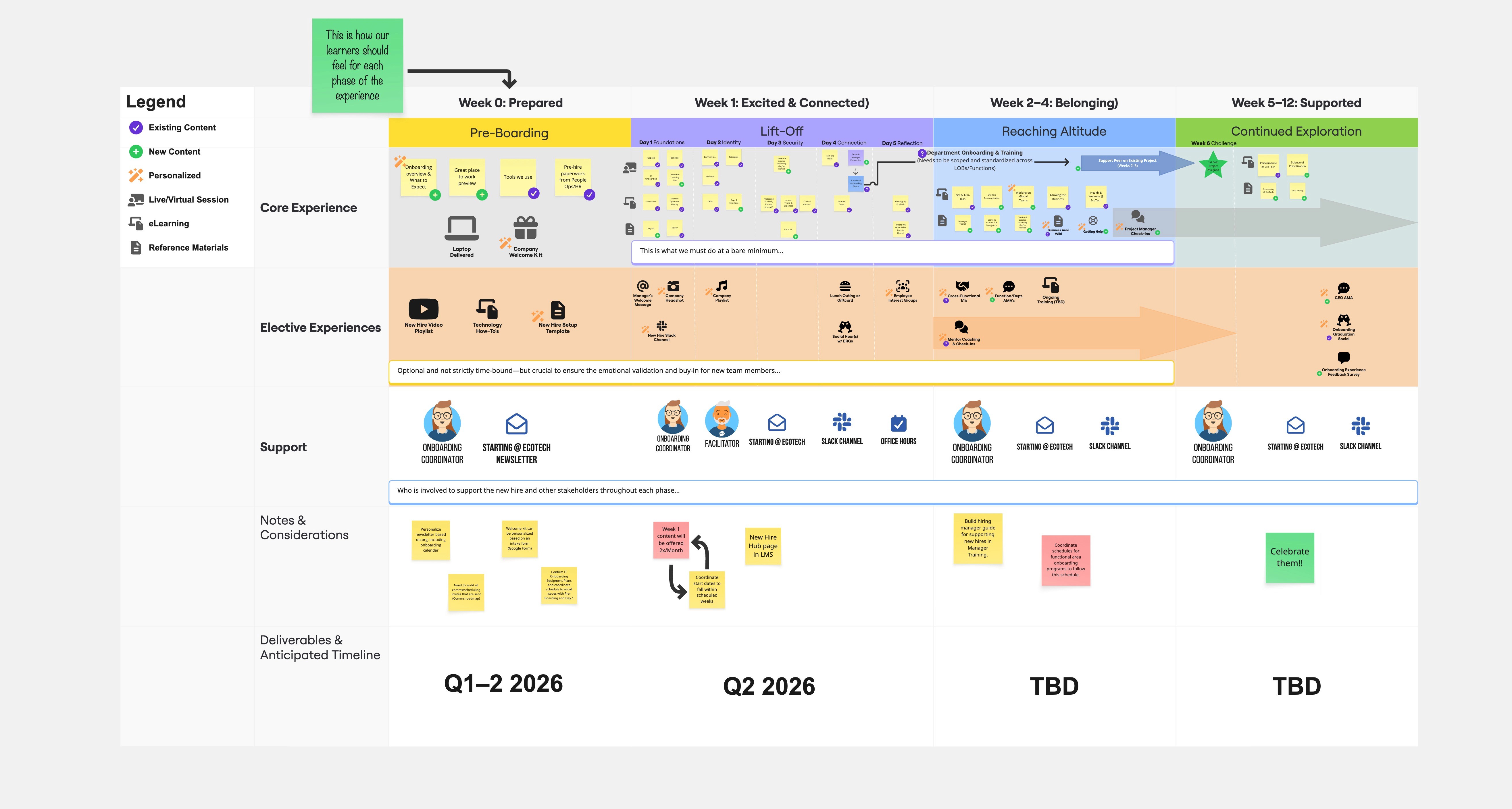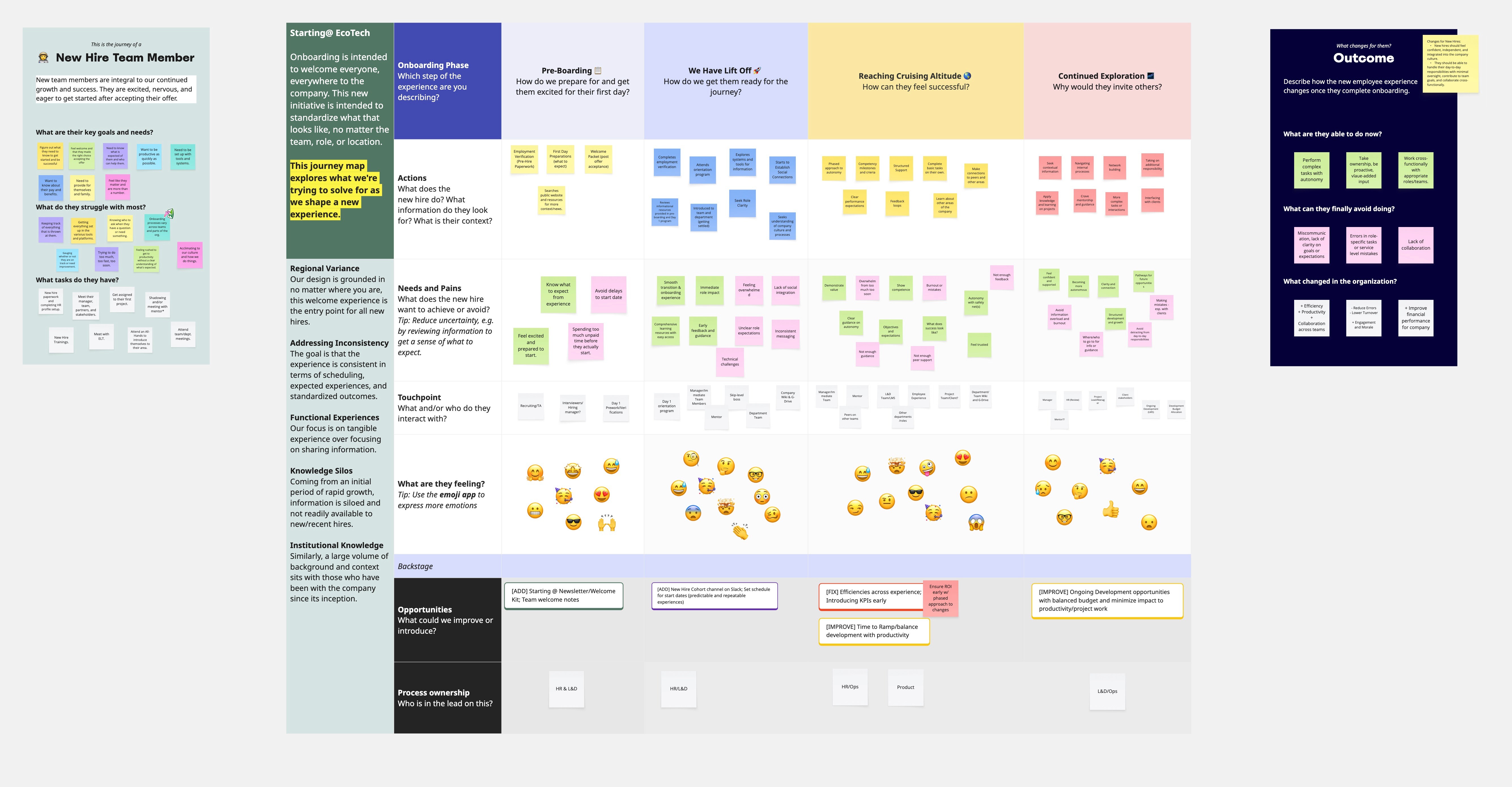 We used Miro to map out the current onboarding process and the separate onboarding program that would happen 1–2 months after the start date.
